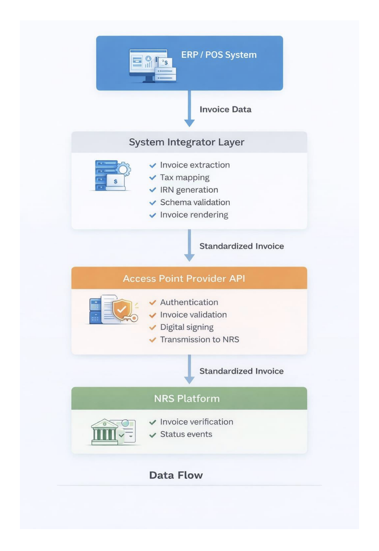 | Access Point Provider API | Authenticates, signs, and transmits the standardized invoice to NRS |
