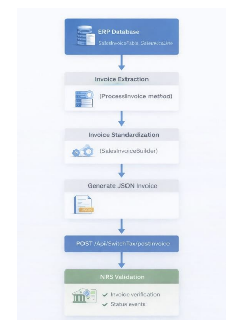 The end-to-end flow from invoice creation to NRS transmission: